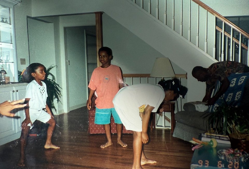 Grattan (right) with his sister Lauren in 1995. Grattan and his family getting ready to dance, shortly after moving in, in 1993. Grattan, in the 1990s. Grattan (left) with his father, in the 1990s.