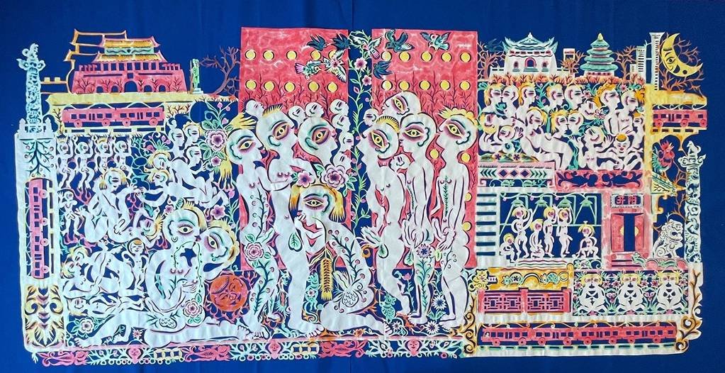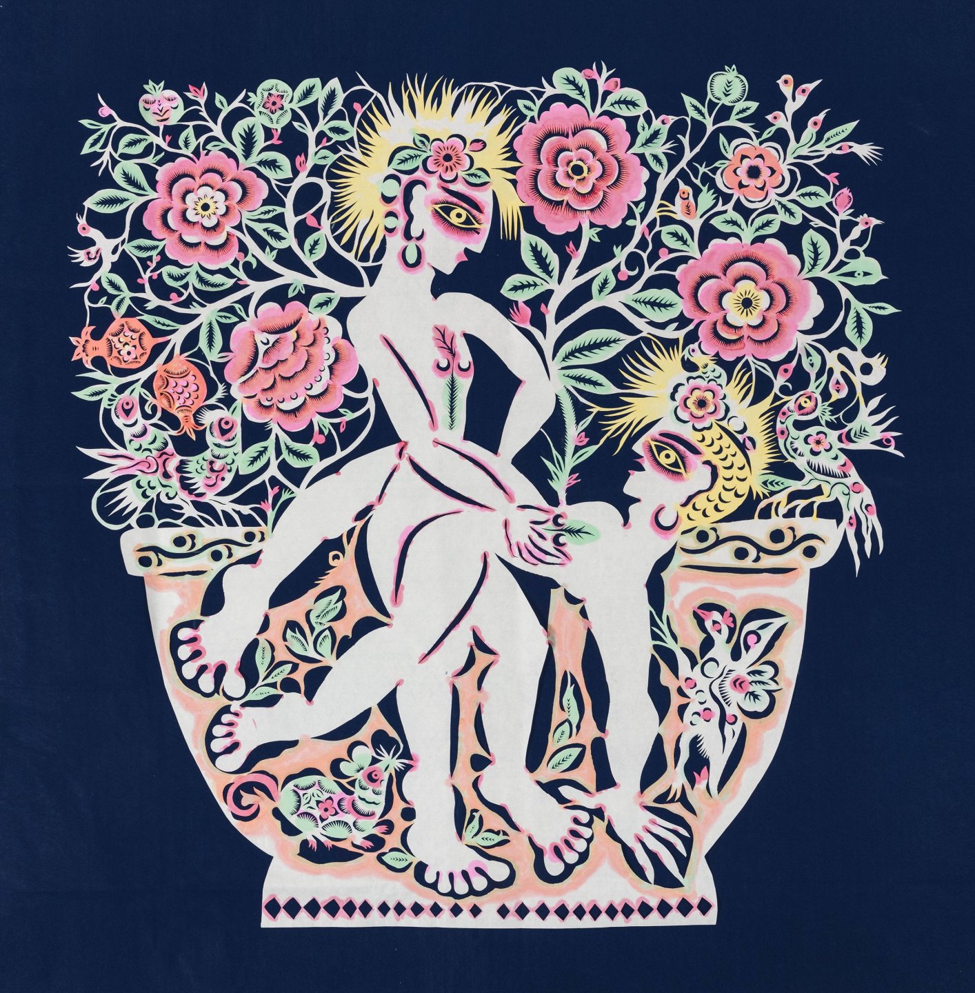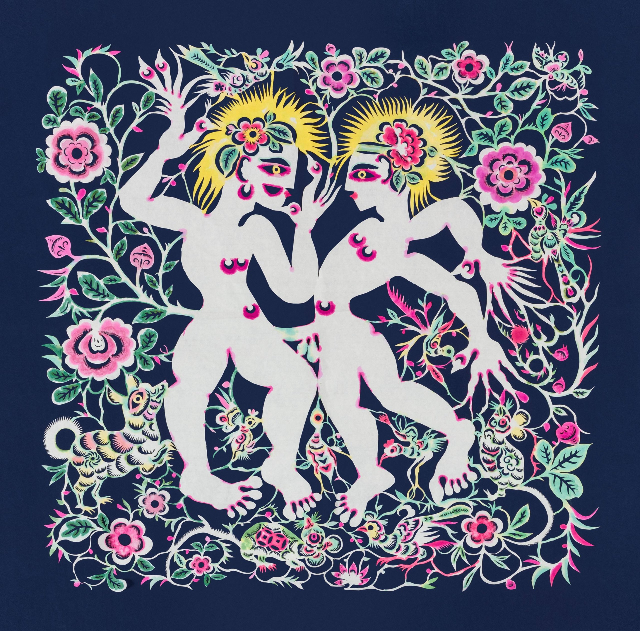 English-language media’s coverage of Xiyadie, the Shaanxi-born, Beijing-based paper-cut artist, often portrays him as a rebellious queer artist working within a conservative Communist society. But these convenient labels struggle to land on the lush and tormented tableaux of Xiyadie’s life and art. His stunningly complex compositions chart both personal narratives—including his experiences as migrant worker, folk artist, queer artist, father, and guilt-laden husband—and an idiosyncratic cosmology of queer navigation and belonging.