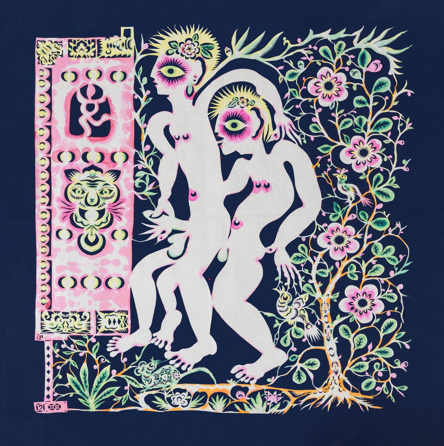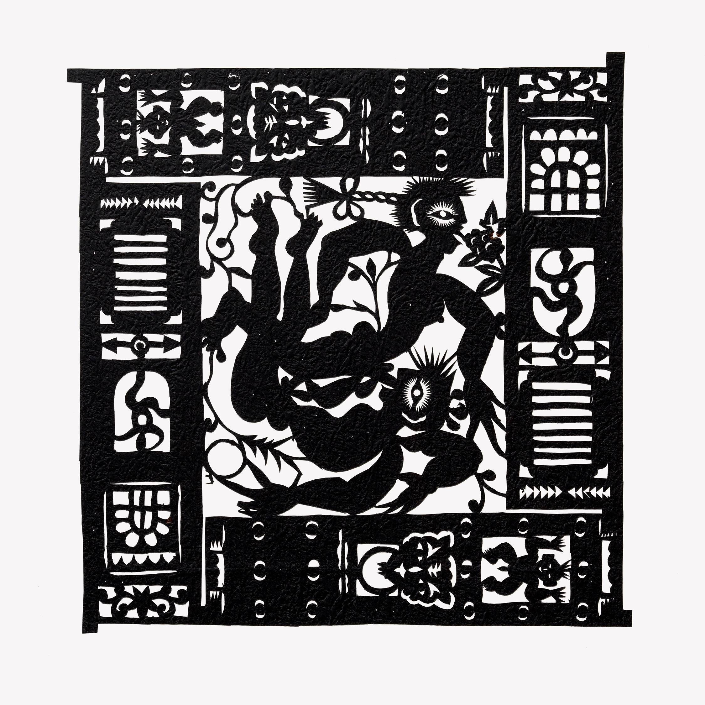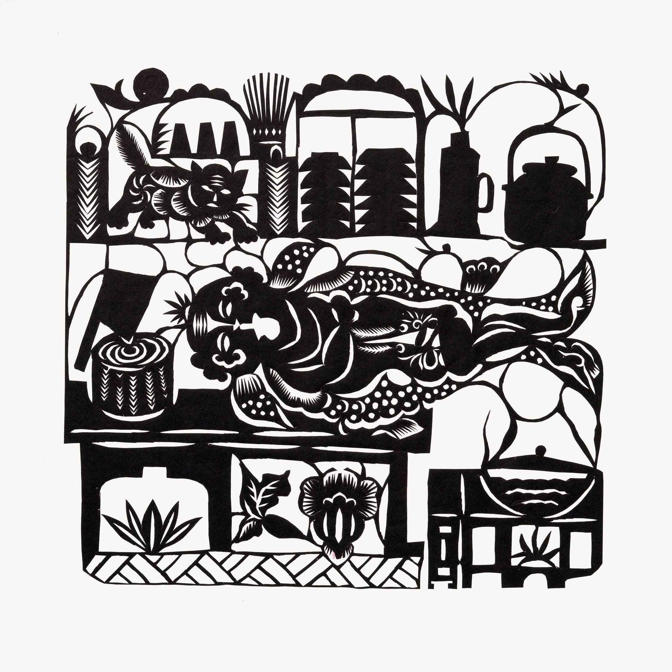 English-language media’s coverage of Xiyadie, the Shaanxi-born, Beijing-based paper-cut artist, often portrays him as a rebellious queer artist working within a conservative Communist society. But these convenient labels struggle to land on the lush and tormented tableaux of Xiyadie’s life and art. His stunningly complex compositions chart both personal narratives—including his experiences as migrant worker, folk artist, queer artist, father, and guilt-laden husband—and an idiosyncratic cosmology of queer navigation and belonging.
